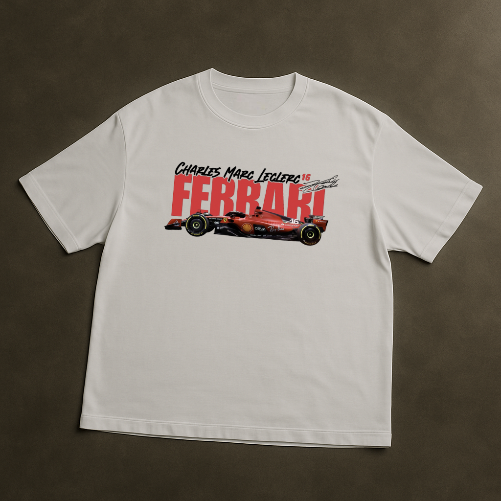 Celebrate speed, precision, and passion with this exclusive Ferrari x Charles Leclerc oversized T-shirt — a tribute to the iconic Scuderia Ferrari F1 Team and one of its brightest stars. The front features a bold illustration of the legendary Ferrari SF car, complemented by Leclerc’s signature and striking red typography. The back showcases a detailed design of F1 car outlines, team logos, and Leclerc’s memorable racing quotes, making it a must-have for every Formula 1 fan.