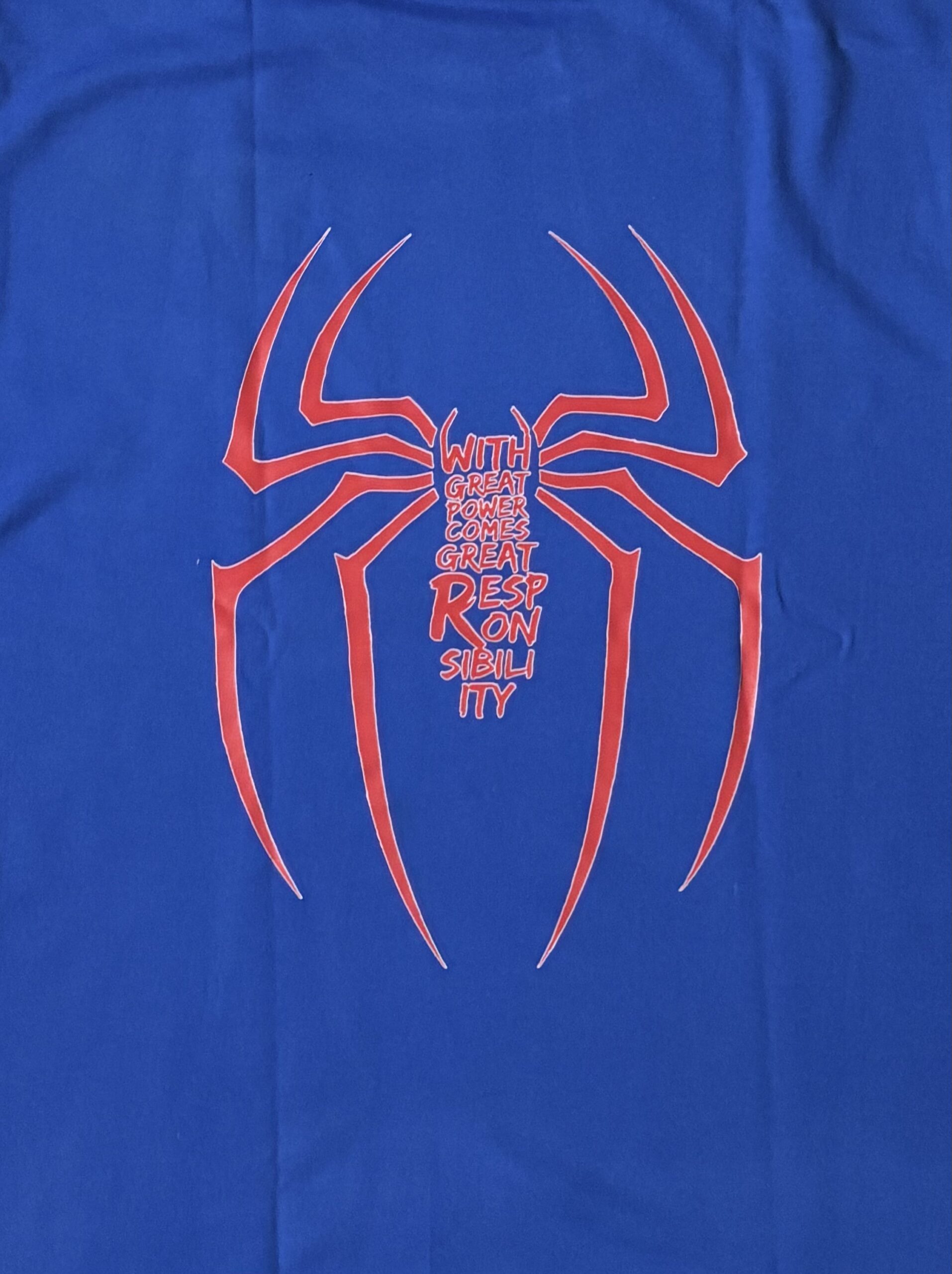 - Back Print: Large spider logo with “With Great Power Comes Great Responsibility” quote